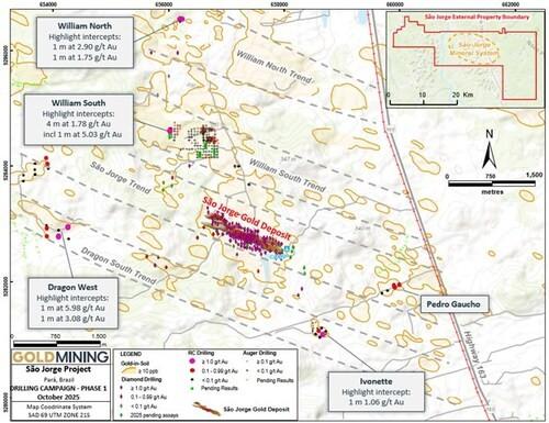 Alastair Still, Chief Executive Officer of GoldMining, commented: “GoldMining is excited to report initial exploration results from our 2025 exploration program designed to test for new targets, outside of known areas of mineralization, at our São Jorge Project. These initial assay results demonstrate at least 4 new zones of mineralization that have never previously been drilled, each of which occurs more than 1 km away from previously known mineralization. The nature and style of mineralization, similar to that of the existing mineral resources at the São Jorge deposit, has ideally positioned us for follow-up drilling that will be designed to better define and quantify additional near-surface mineralization occurring over a 12 km x 7 km geochemical footprint identified over the São Jorge property-scale mineral system.