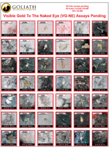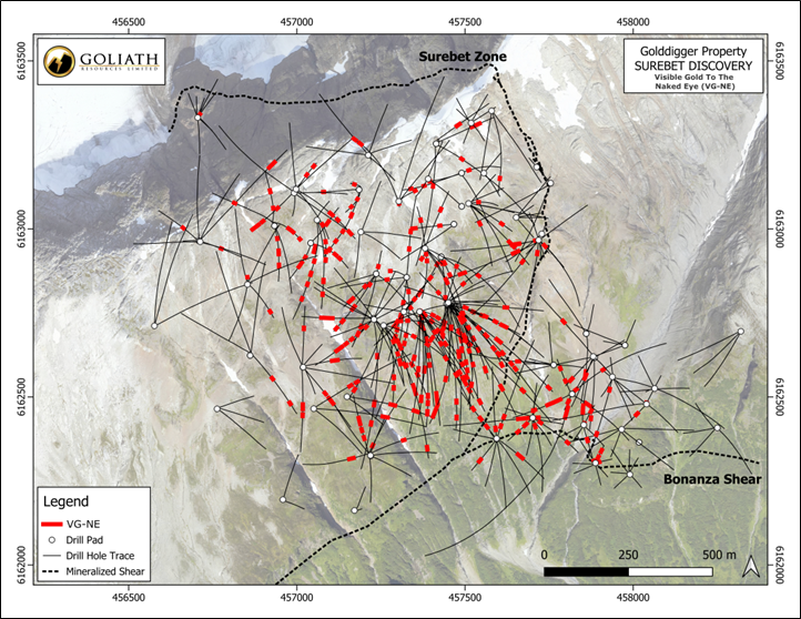 Mr. Roger Rosmus, Founder & CEO of Goliath states: “The Surebet high-grade gold discovery continues to consistently deliver good assay results, which clearly shows continuity and predictability. Particularly noted by the vast distribution of VG-NE in drill holes spanning an area for over 1,200 metres from northwest to southeast, over 1,000 meters from northeast to southwest and over 800 meters of vertical relief. Within that area are a series of gently dipping stacked veins that dip to the southwest, and another series of gently dipping stacked veins that dip to the southeast. They remain open in the down dip direction of both, suggesting that both could have separate sources feeding each series of stacked veins that would be over 4,000 metres apart. Or one magmatic event that is feeding from either side of it. Equally as impressive are the vertical RIRG dykes coming up through stacked veins, which suggests that there is a magma chamber below the entire mineralized area. At the intersections of the gently dipping veins and the vertical RIRG dykes (called Goldilocks zones) there are two temperature regimes for the VG-NE enriching the zones. Plus, we have found VG-NE within a third rock package with minimal drilling into those zones. Collectively, it is apparent that we are nowhere near the limits of the system, in fact, there is a good chance that we may only be halfway down the various zones with plenty more room to grow the system. Our team looks forward to receiving the assays from remaining holes so we can update the 3D model.”