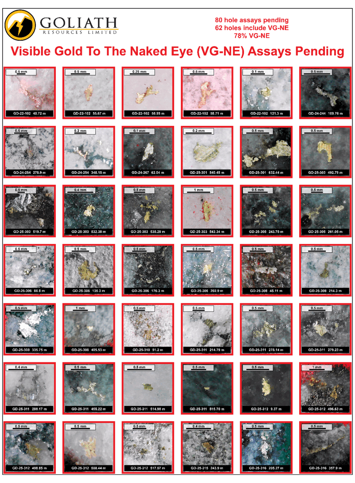 • 83 out of 110 holes (or 76%) drilled in 2025 contain VG-NE and 100% of drill holes have intersected substantial quartz-sulphide mineralization. Assays are still pending for 80 holes from this year’s exploration campaign, of which 62 (representing 78% of the total pending) contain visible gold to the naked eye (VG-NE). See news releases dated: October 27, 2025, September 22, 2025, September 8, 2025, August 26, 2025, and July 28, 2025.