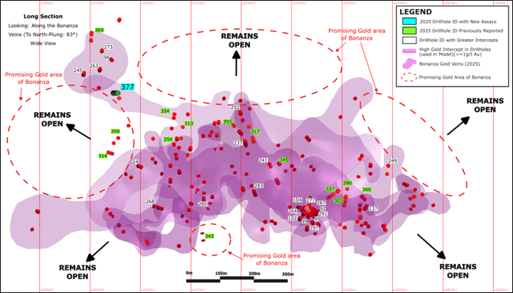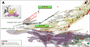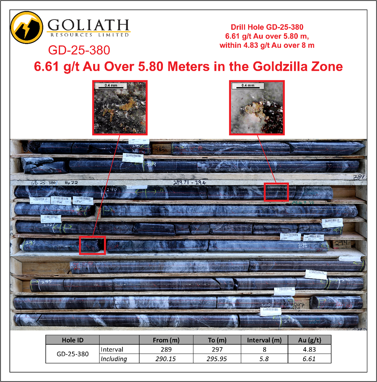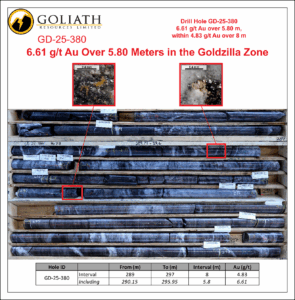 • Drill hole GD-25-380 intersected 6.61 g/t Au over 5.80 meters, within 4.83 g/t Au over 8.00 meters from an interval corresponding to the Goldzilla Vein containing VG-NE in quartz-sulphide veins. The intercept is approximately true width, and these assays reflect gold only (AuEq value in the interval will be adjusted accordingly once Ag, Cu, Pb and Zn are received); see image below.