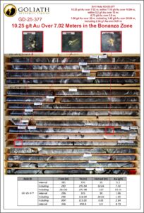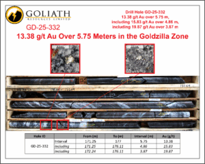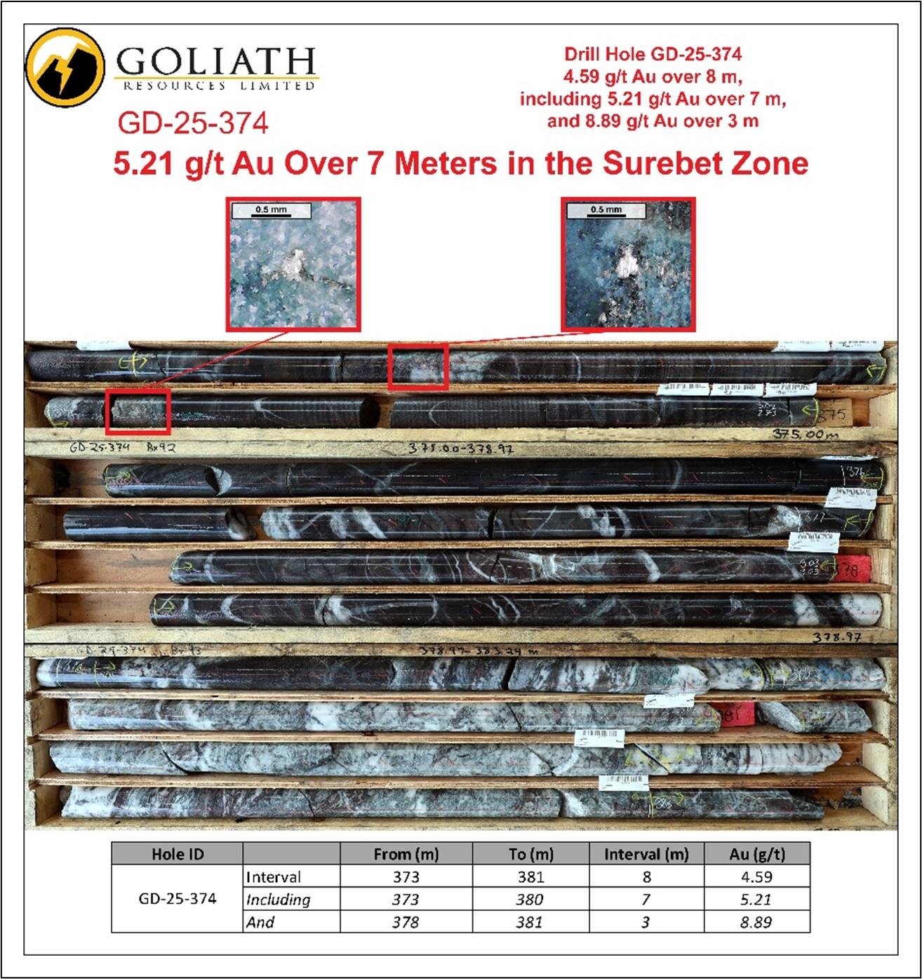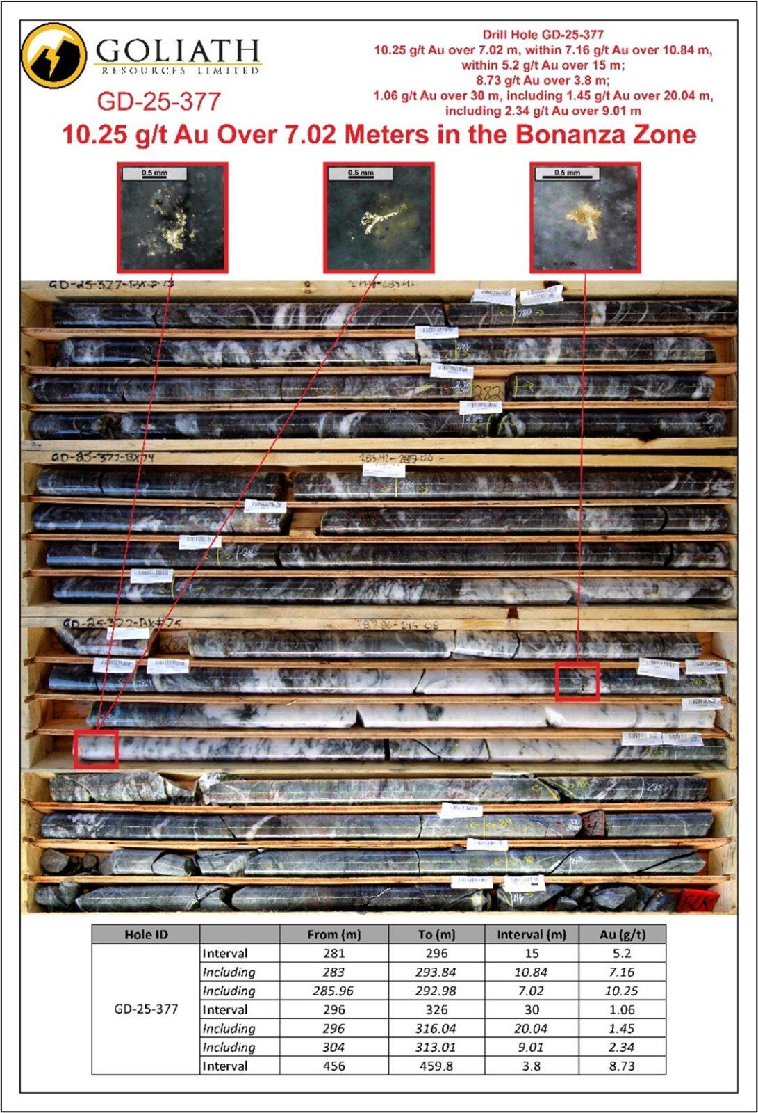 Goliath Resources Limited (TSX-V: GOT) (OTCQB: GOTRF) (FSE: B4IF) is pleased to announce additional assay results from its 2025 drill program where drill hole GD-25-377 intersected three separate mineralized intervals up to 10.25 g/t Au over 7.02 meters, within 7.16 g/t Au over 10.84 meters, within 5.20 g/t Au over 15.00 meters containing multiple occurrences of VG-NE within a zone of strong quartz-sulphide veining hosted in the Bonanza Zone that remains open at the Surebet Discovery on its 100% controlled Golddigger Property, Golden Triangle, British Columbia. Assay results from the Surebet Discovery continue to confirm desirable widths and grades with consistent continuity. These results have extended the high-grade core by 80 meters to the NW for a total of 580 meters and remains open. Remaining drill results from the 2025 drill season have strong potential to continue to provide desirable widths and grades and continuity as observed thus far.