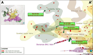 Drilling was focused on expanding the Surebet high-grade gold discovery and has intersected high-grade gold mineralization in multiple drill holes along 580 meters of strike, delineating broad zones of high-grade gold mineralization within the Surebet-Bonanza intersection domains as well as the Goldzilla Vein confirming desirable grades, widths and continuity as demonstrated by drill results to date.