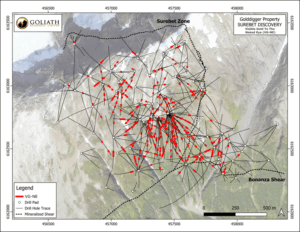 • Goliath has drilled over 156,000 meters with over 600 pierce points in the Surebet Discovery located at the Golddigger property between 2021 and 2025.