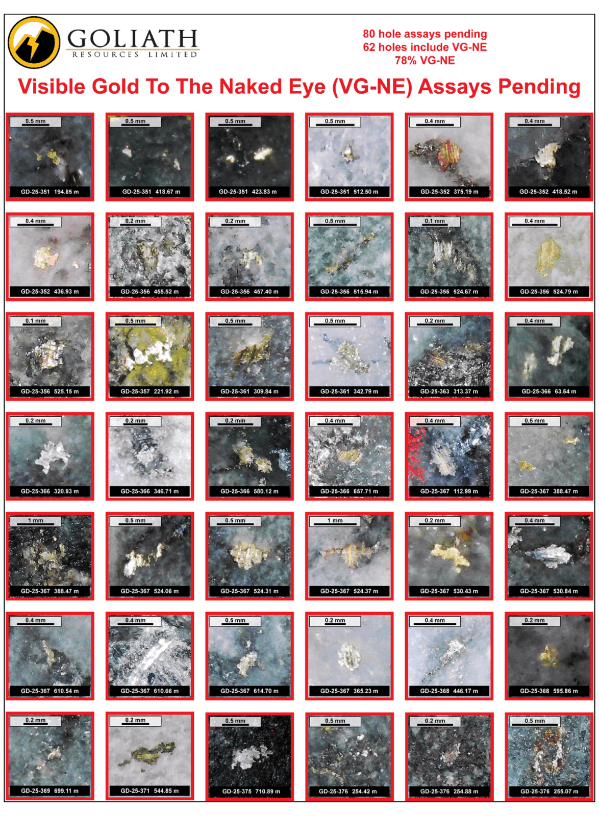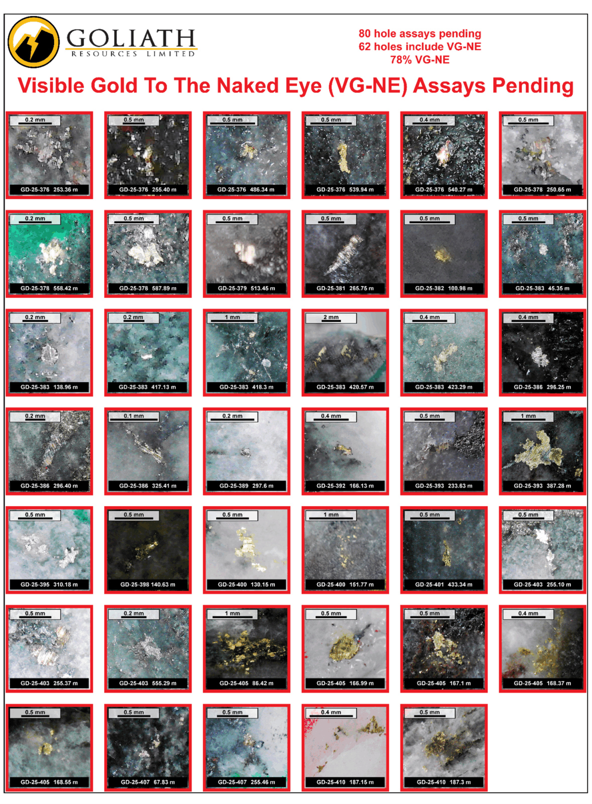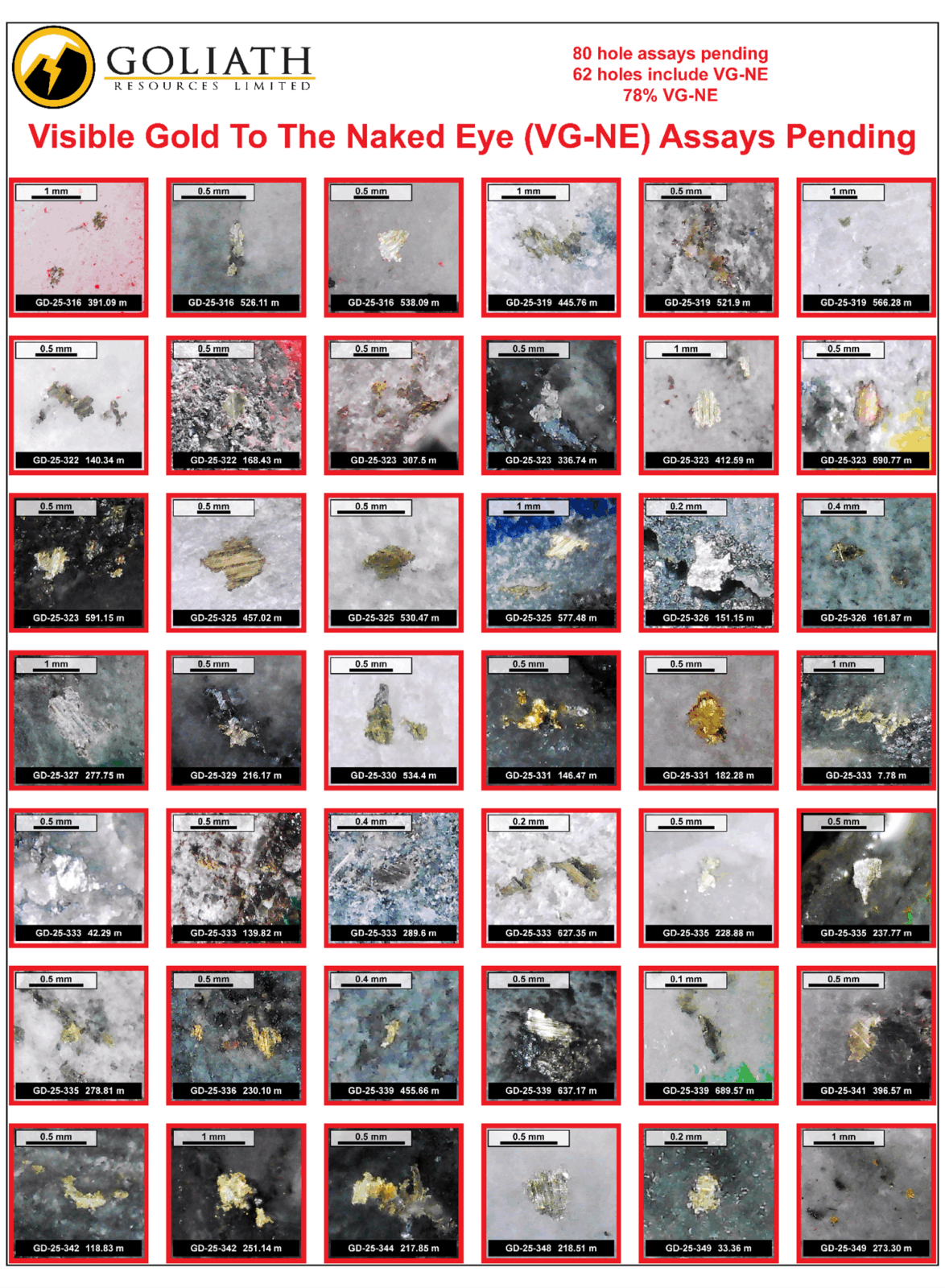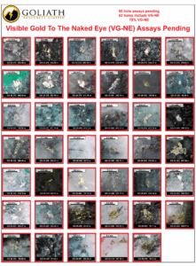 Assays are still pending for 80 holes from this year’s exploration campaign, of which 62 (representing 78% of the pending holes) contain VG-NE (see images above).