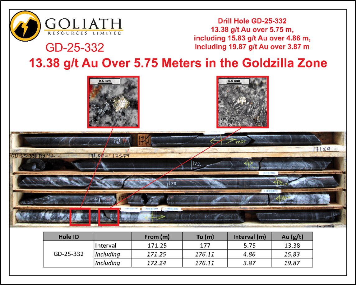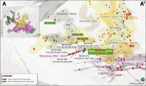 Drill hole GD-25-377 intersected three separate intervals. The first assayed 10.25 g/t Au over 7.02 meters, within 7.16 g/t Au over 10.84 meters, within 5.20 g/t Au over 15.00 meters containing multiple occurrences of VG-NE within a zone of strong quartz-sulphide veining hosted in the Bonanza Zone that remains open. The second intersected a broad interval of the Bonanza Zone that remains open and assayed 1.06 g/t Au over 30.00 meters, including 1.45 g/t Au over 20.04 meters, including 2.34 g/t Au over 9.01 meters, as well as a third interval that assayed 8.73 g/t Au over 3.80 meters. Drill hole GD-25-332 intersected 13.38 g/t Au over 5.75 meters, including 15.83 g/t Au over 4.86 meters, including 19.87 g/t Au over 3.87 meters part of a zone of quartz-sulphide veining containing multiple occurrences of VG-NE hosted in in the Goldzilla Vein that remains open. Drill hole GD-25-380 intersected 6.61 g/t Au over 5.80 meters, within 4.83 g/t Au over 8.00 meters from an interval corresponding to the Goldzilla Vein containing VG-NE in quartz-sulphide veins. Drill hole GD-25-374 intersected 4.59 g/t Au over 8.00 meters, including 5.21 g/t Au over 7.00 meters, including 8.89 g/t Au over 3.00 meters from a zone of strong quartz-sulphide stockwork part of the Surebet Zone containing multiple occurrences of VG-NE.