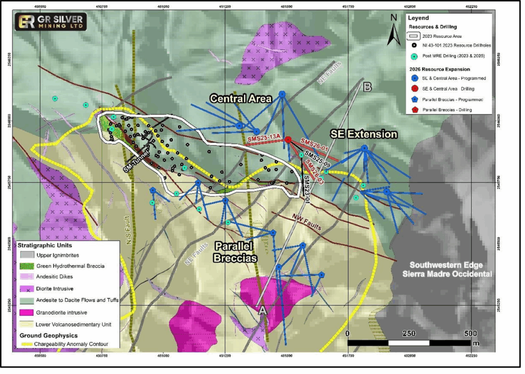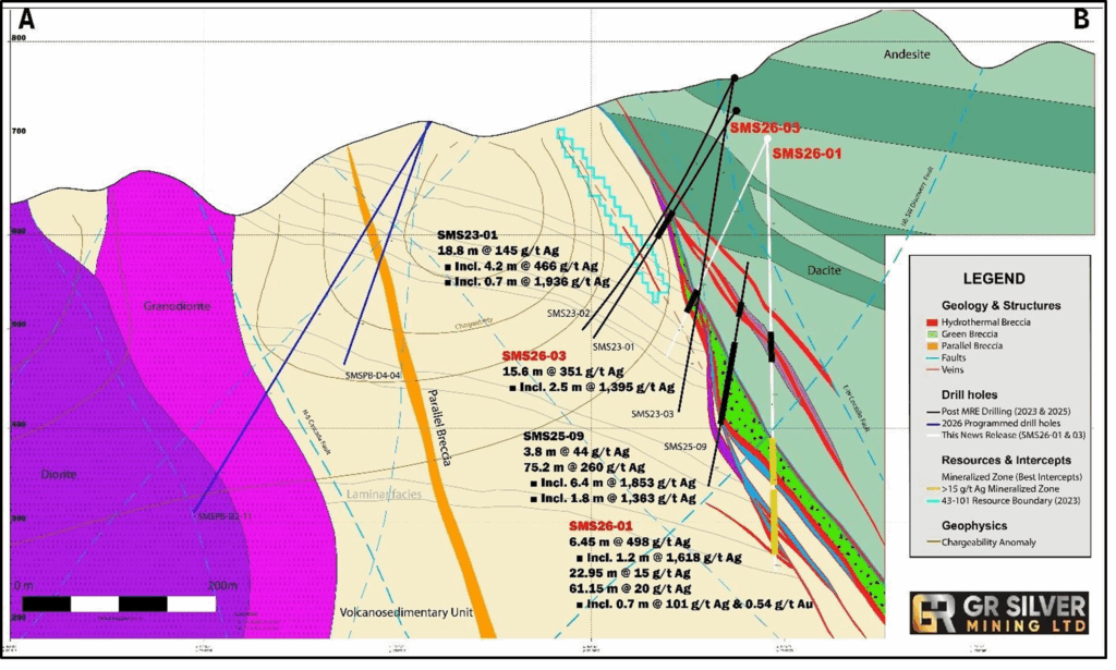 GR Silver Mining Ltd. (TSX-V:GRSL) (OTCQX:GRSLF) (FRA:GPE) is pleased to announce results from drill holes SMS26-01 and SMS26-03 in the SE Area of San Marcial that confirm the continuity of high-grade silver mineralization up to 500 metres down dip from surface.