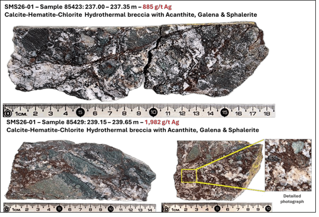 SMS26-01 intersected two distinct mineralized zones (Figure 2) controlled by the intersection of the NW–SE trending San Marcial breccia and NE-trending faults. The upper mineralized zone corresponds to an andesitic dyke cross-cutting the upper Oligocene volcanic sequence, which was previously interpreted as being barren. This high-grade silver intercept opens new exploration potential in the upper part of the system, above the hydrothermal breccias. The lower zone is hosted within chlorite–hematiterich breccias, located approximately 75 metres below the extensive high-grade interval of SMS25-09. It comprises a broad interval of continuous low-grade silver mineralization, indicating that the system remains open at depth.