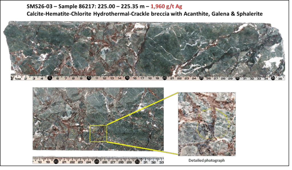 SMS26-01 confirms the continuity of silver mineralization within both the chlorite-hematite hydrothermal breccias and the overlying Oligocene units (Figure 3), where quartz-calcite-sulfide veining crosscuts earlier breccias. In comparison with typical epithermal deposit models, boiling textures with calcite and high-grade silver (argentite and acanthite) suggest that high-grade silver mineralization should remain open at depth for at least another 100 metres below current intercepts.