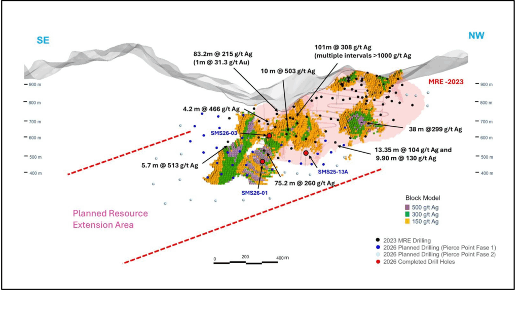 Two silver-mineralized zones were intersected, including multiple intervals of high-grade silver, near the 2023 Expansion Drilling Program, and located on the same cross section as SMS25-09, which returned 75.2 m at 260 g/t Ag (see News Release dated September 3, 2025).