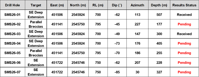 SMS26-01 and SMS26-03 represent the first drill holes completed in the SE Area as part of the 2026 Step-Out Drilling Program (Figure 1). The program is currently supported by two drill rigs on site, with additional rigs in transit to complete the planned 20,000 metres by H2 2026.