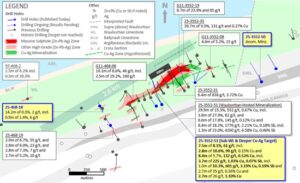 “Today’s results represent a major step forward in our understanding of the Deeper Cu-Ag target at Ballywire,” stated Bart Jaworski, CEO. “With significant Cu-Ag bearing fault structures now pierced along two drill fences located 350m apart, we have much higher conviction that Deeper Cu-Ag mineralization may extend across the entire discovery to date. This may also help us vector towards more mineralization beyond the current discovery footprint. It is also highly encouraging that today’s results immediately below the Waulsortian Limestone add up to our best hit to date – over 50m of strong zinc-lead and silver mineralization with significant copper grades. Overall, today’s intercepts demonstrate that Ballywire’s exploration upside continues to accelerate. With a robust treasury and our most ambitious drill campaign to date – four rigs turning at Ballywire – we are poised to continue unlocking this discovery’s full potential over the coming months.”