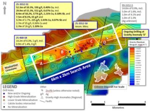 Note: Of the four gravity-high anomalies above, only the ‘C’ anomaly has been systematically drilled to date; “Anom. Minz” means anomalous mineralization (see text for details)
