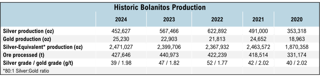 2024 production at Bolanitos totaled 2,471,027 silver-equivalent (AgEq) ounces from 427,646 tonnes grading 39 g/t silver and 1.98 g/t gold for 452,627 ounces of silver and 25,230 ounces of gold. Silver and gold recoveries were 84.4% and 92.7% respectively. AgEq was calculated at 80:1 silver to gold ratio (see Endeavour MD&A for the year ended December 31, 2024). Production at Bolanitos has been relatively consistent for several years and will add incrementally to Guanajuato Silver’s total annual production.