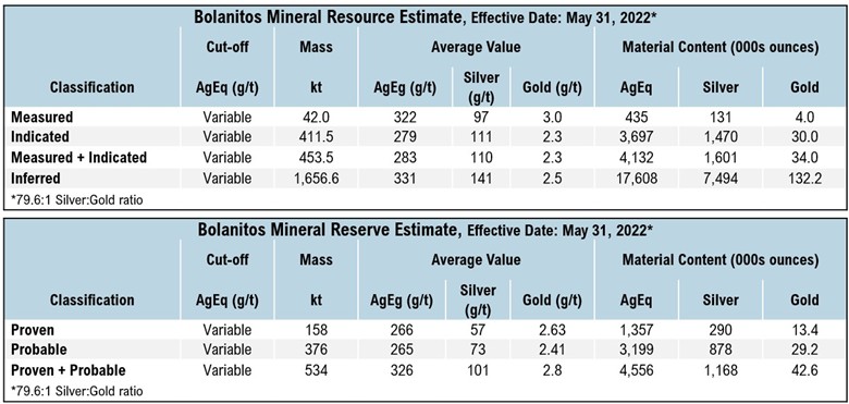 Silver equivalent calculation (AgEq) for the Bolanitos Mineral Reserve and Mineral Resource estimate is based on a 79.6:1 silver to gold price ratio. Mineral Resources that are not Mineral Reserves do not have demonstrated economic viability.