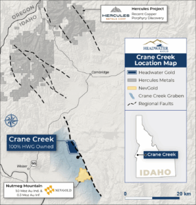 Headwater Gold Inc. (CSE: HWG) (OTCQB: HWAUF) is pleased to announce that it has entered into a definitive earn-in agreement with a subsidiary of Centerra Gold Inc. (TSX: CG) for Centerra to earn up to a 70% interest in Headwater’s Crane Creek project in Idaho through staged exploration expenditures totalling up to US$25,000,000 and the completion of a preliminary economic assessment report.