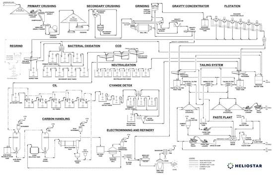 Mill feed will be fed to an 1,800 tpd processing facility consisting of a 2-stage crushing circuit feeding a ball mill. Free gold will be captured using gravity concentrators before moving into a flotation circuit. It is expected that the gravity circuit will recover 15-20% of the gold. The flotation concentrate will be fed into a 250 tpd bio-oxidation circuit, expected to increase the overall recovery to 90%. The operation is planned to produce doré bars on site. Approximately 40% of the tailings will be placed back underground as paste backfill with the remainder stored in a lined, dry-stack tailings storage facility. A maintenance shop, warehouse and offices will also be constructed. Power is expected to be connected to the national grid system by installing an electrical substation and new transmission line. Water will be sourced from mine de-watering activities during operations, augmented by groundwater from a new well, as required. A new camp will be developed to accommodate an estimated 336 people in addition to employing people in the nearby communities. Mining will be carried out by a contractor supplying their own mobile equipment.
