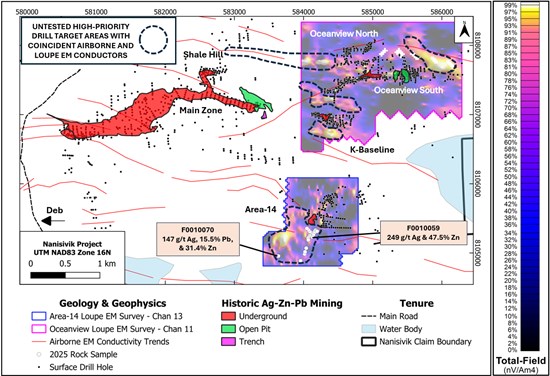 The Company’s Executive Chairman, Chad Williams, commented, “The recent surface exploration program completed at Nanisivik was a success: several large new zones with strong conductivity at the Area 14 and Oceanview targets were discovered. Some of these new zones may significantly extend the strike length of unmined mineralization at these targets while other new zones may represent completely new areas of mineralization. We are also very encouraged with assay results up to 249 g/t silver and 51.5% zinc collected from distal zones at the Area 14 target that coincide with underlying conductors from the Loupe EM survey. Nanisivik was a high-quality mining operation until 2002 when low commodity prices forced the mine to cease operations. We plan to drill these high-priority targets in 2026. We believe Nanisivik has substantial exploration potential.”