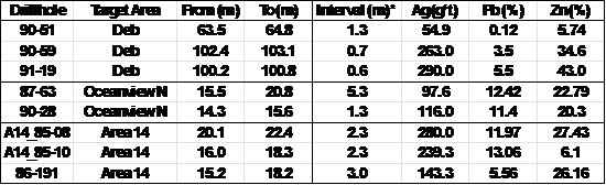 Earlier in the year, the Company announced three priority target areas that were identified during data review, each hosting significant zinc and silver intercepts from historical drilling (see press release dated March 25, 2025). The areas are Deb, Ocean View North, and Area 14. A review of historical exploration drilling at the former mine site identified several significant drill intersections located outside mined areas. These discoveries were not followed up in the past due to the previous operator’s tight focus on production. As a result, each of these represents a priority target for follow up work. A selection of significant silver and/or zinc mineralized intercepts from these priority target areas is provided in the Table 2 and the locations of the target areas are illustrated in Figure 1.