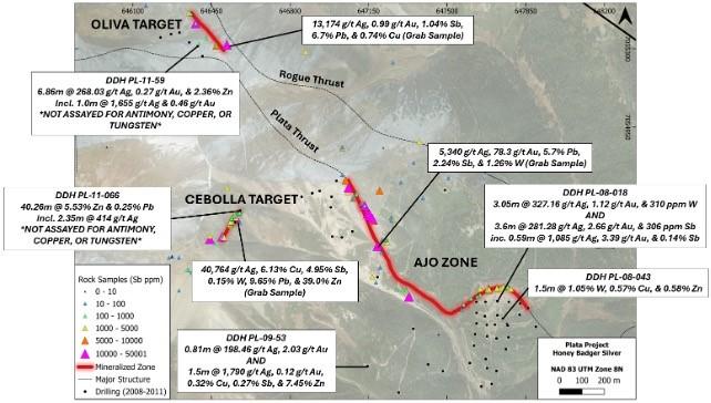 Antimony mineralization is widespread at Plata and is present in the Ajo Zone, as well as both the Cebolla and Oliva targets. High-grade antimony importantly occurs throughout the entire length of the Ajo Zone, where 62 out of 144 rock samples collected along or adjacent to the structure returned over 0.1% Sb, 17 samples returned over 1.0% Sb, and five samples returned above the overlimit detection value of 5.0% Sb (Fig 1). Antimony mineralization at Ajo is also positively reflected in historical drill results and shows a strong positive correlation to silver. Antimony highlights from select drill results at Ajo include 1.5m @ 1,790 g/t Ag, 0.12 g/t Au, 0.32% Cu, 0.27% Sb, and 7.45% Zn (PL-09-53), 1.21m @ 1,255.36 g/t Ag, 1.11 g/t Au, & 0.14% Sb (PL-08-016), and 0.59m @ 1,085 g/t Ag, 3.39 g/t Au, & 0.14% Sb (PL-08-018). High-grade antimony is also present at both the Cebolla and Oliva targets with rock sample grades up to 4.95% Sb at Cebolla and 4.72% Sb at Oliva. Drill core from the Cebolla and Oliva targets was not assayed for antimony along with select drill core from Ajo, however the widespread presence of antimony with silver mineralization on surface in these areas indicates it may also be present at depth.
