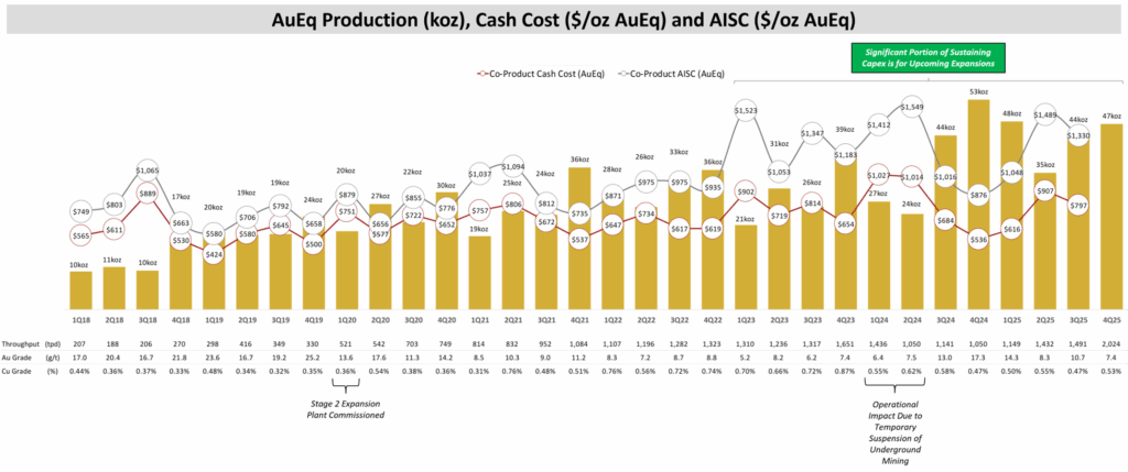 Note (1): Gold equivalent production for Q4 2025 is calculated based on: gold $4,131 per ounce; silver $56.44 per ounce; and copper $5.11 per pound. Gold equivalent grade for Q4 incorporates realized recoveries of 94.3% for Au, 93.9% for Cu and 82.6% for Ag.
