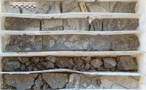 Hole LC-25-008 (Table 1; Table 2; Table 3) intersected an alteration zone with massive sulphide mineralization from approximately 154.5 to 165.0 meters (10.50 meters) downhole. The silver rich massive sulphide mineralization comprises sphalerite, galena, arsenopyrite, and pyrite (Figure 3 and 4). The mineralization is strongly anomalous in pathfinder elements antimony, bismuth, indium, arsenic and tellurium (Table 1). Silver values vary with galena-sphalerite content. Significant gold is associated with the high-grade silver mineralization and varies with the arsenopyrite content. Of note is the presence of associated elevated to anomalous tellurium, a significant indicator of gold mineralization. The mineralization exhibits late-stage faulting and brecciation. The hole bottomed in a fine to medium grained feldspar porphyry carrying disseminated pyrite confirming the interpretation of the magnetics.