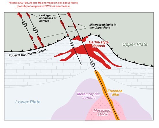 Drill results and logging confirm Carlin-type fluid signatures are present in PW25-02 and PW25-03, representing a possible Carlin-type gold system within the PWC claim block. These fluids are not only present in the lower plate (Horse Canyon and Wenban formations) but also as leakage anomalies along brittle high-angle structures in the upper plate above the Roberts Mountains Thrust that could be the source of the gold-in-soils at surface (Figure 2). Tracking these faults down to a higher grade trapped source is one target concept. Mineralized faults in the upper plate rocks are significant with notable discoveries in the Cortez and Carlin districts such as the Meikle and Fourmile deposits showing leakage of Carlin-type hydrothermal fluids from the lower plate to the upper plate (See Figure 3 below). Additional framework drilling in 2026 is planned to develop vectors towards possible high-grade mineralized zones.