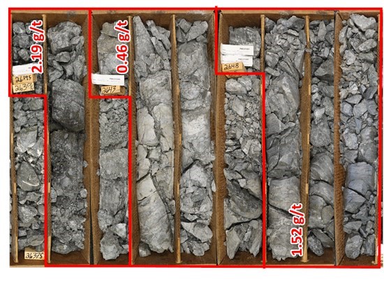 Figure 4. Core box photos of PW25-03 2,639ft (804.37m) to 2,653ft (808.63m) fault gouge in high angle upper plate structure with carbon seam and gold plus As, Sb, Hg and Tl.