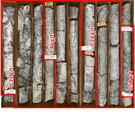 (Core drill intercepts are apparent thickness and the true thickness is not known at this time. Further drilling and analysis will be required to determine true thickness.)