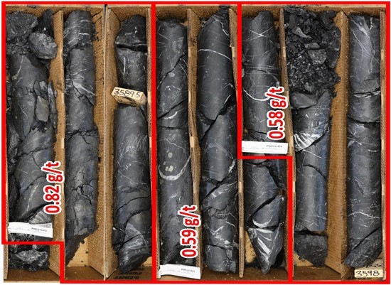 Figure 6. Core box photos of PW25-03 lower plate from 3,585ft (1,092.7m) to 3600ft (1097.28m) showing black carbonaceous laminated Wenban limestone with disseminated Carlin-type gold mineralization.