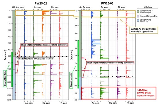 PW25-02 and PW25-03 drill holes are 250m apart and were targeting concepts around gold-in-soil anomalies. The two holes have similar geochemical properties, both cut by high-angle structures with anomalous gold and pathfinder elements and show evidence of significant folding. PW25-03 contains significantly higher gold values, and structural zones with much elevated pathfinder element values. The downhole lithology and geochemistry, shown in Figure 7 below, indicates the approximate location of the RMT at 2,950ft (899.2m). Both drill holes also show spikes in gold and trace element values at high-angle structures in the upper plate section and elevated gold and trace element values indicating disseminated mineralization, such as the 149.05m (489ft) thick section of carbonaceous limestone of the Wenban Formation at the bottom portion of the drill hole PW25-03.