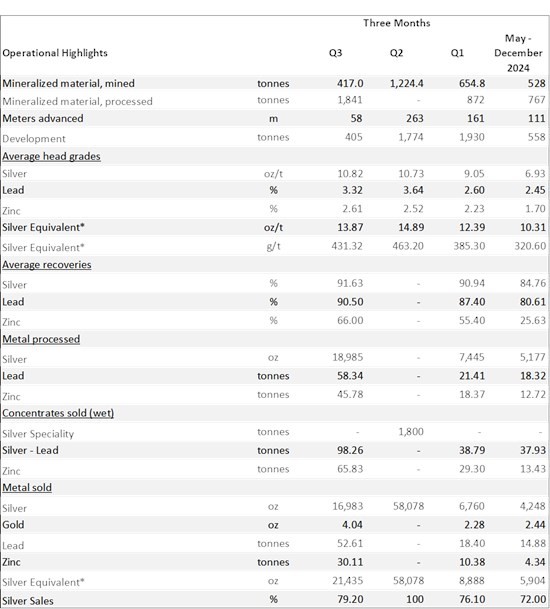 *prices for silver equivalent calculations use period ending spot prices and are as follows: Sept. 30, 2025 period; silver $46.56/oz, gold $3,846/oz, lead $1,964/tonne, zinc $2,938/tonne Jun. 30, 2025 period; silver $36.00/oz, gold $3,303/oz, lead $2,205/tonne, zinc $2,764/tonne, Mar. 31, 2025 period; silver $34.46/oz, gold $3122.80/oz, lead $2002/tonne, zinc $2829/tonne, and Dec. 31, 2024 period; silver $28.90/oz, gold $2606.72/oz, lead $1921.50/tonne, zinc $2974/tonne