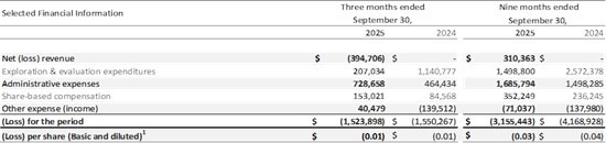 For the nine months ended September 30, 2025, Kuya Silver recorded a net loss of $3,155,443, improving from a net loss of $4,168,928 in the same period of 2024. The improvement reflects revenue generation from Bethania and reduced exploration spending as the operation moved further into development and ramp-up.