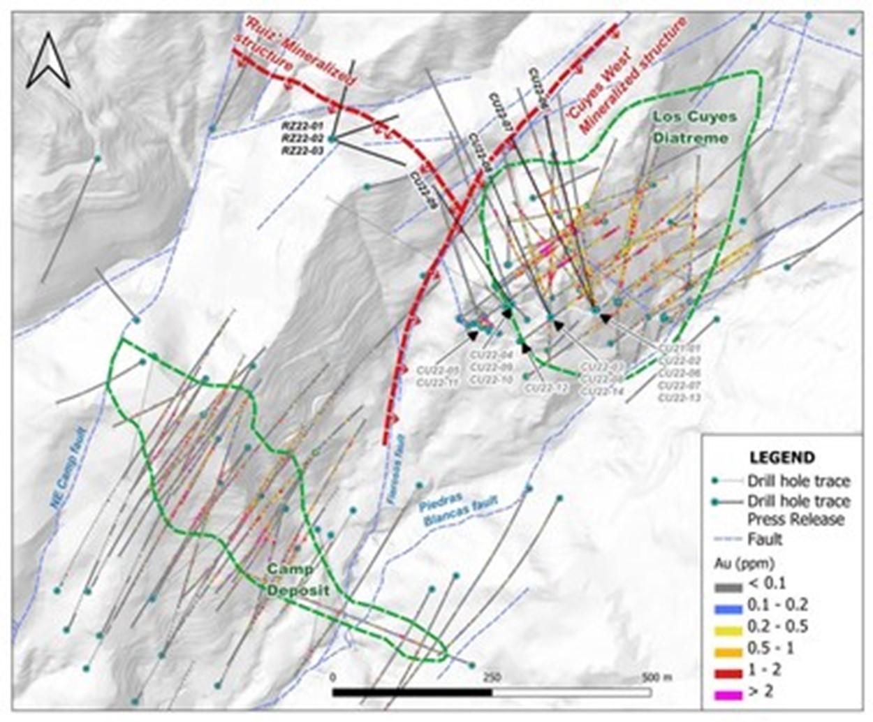 Luminex Resources Corp. (TSX-V: LR) (OTCQX: LUMIF) is pleased to announce drill results from four holes at the Cuyes West structure and from three holes at the Ruiz structure. At Cuyes West, the current drilling has confirmed the strike length of the structure is in excess of 300 metres, and it has been mapped at surface for more than 500 metres. The drill intersection in hole CU22-12, the deepest so far, indicates that it has a vertical extent of at least 250 metres. The western edge of the Cuyes West structure is approximately 300 metres from the Camp deposit.