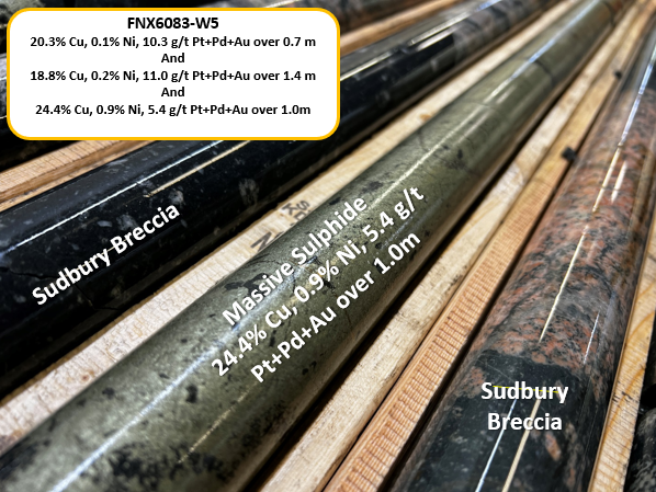 Diamond drill holes FNX6083-W5 and FNX6070-W1 in today’s news release were designed to continue to expand the known R2 Zone mineralization, both up dip and down plunge to the south (see news releases dated August 28, 2025, October 23, 2025, and December 9, 2025). Drill hole FNX6083-W5 targeted the area up dip from FNX6083-W1 and encountered four veins over 28.6 metres, approximately 50 metres above the massive sulphide veins intersected in FNX6083-W1. The massive sulphide vein mineralization in FNX6083-W5 returned assays up to 24.4% Cu, 0.9% Ni, 3.7 g/t Pt, 1.3 g/t Pd, 0.4 g/t Au, and 173 g/t Ag over 1.0 metre (Figures 2, 3 and Table 1). Additional wedge holes are in progress to further test the up dip potential of the R2 Zone towards the No. 3 Footwall Zone. Drill hole FNX6070-W1 was drilled from the same platform as FNX2026-W1 and FNX2026-W2 and targeted the area to the south and down plunge of the mineralization encountered in FNX2026-W2. Drill hole FNX6070-W1 intersected four mineralized intervals over 39.3 metres, including 5.7% Cu, 0.1% Ni, 7.0 g/t Pt, 18.8 g/t Pd, 2.5 g/t Au, and 33.3 g/t Ag over 1.1 metres, within a longer interval which returned 7.7 metres of 1.3% Cu, 0.1% Ni, 2.0 g/t Pt, 3.7 g/t Pd, 0.7 g/t Au, and 8.6 g/t Ag. The vein system which defines the R2 Zone has now been intersected over a vertical extent of approximately 300 metres and a north-south extent of approximately 150 metres. The R2 Zone remains open up dip towards the No. 3 Footwall Zone as well as at depth towards the Morrison Footwall Cu-PGE Deposit, located 600 metres to the southwest.