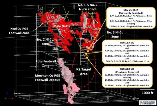 Magna Mining Inc. (TSX-V: NICU) (OTCQX: MGMNF) (FSE: 8YD) is pleased to provide an update on exploration activities and assay results from ongoing exploration at the past-producing Levack Mine, located in the North Range of the Sudbury Basin, northeastern Ontario, Canada (Figure 1). Drillhole FNX6083-W2 was targeted approximately 40 metres to the north of drill hole FNX6083-W1 (see News Release dated August 28, 2025) and below drill hole MLV-25-14A which intersected 2.6% copper, 8.1% nickel and 17.8 g/t platinum + palladium + gold over 0.6 metres. Drillhole FNX6083-W2 intersected multiple mineralized intervals including copper rich chalcopyrite veins grading up to 19.3% copper and 26.1 g/t platinum + palladium + gold, as well as nickel rich pyrrhotite-pentlandite veins grading up to 12.4% nickel and 24.2 g/t platinum + palladium + gold.