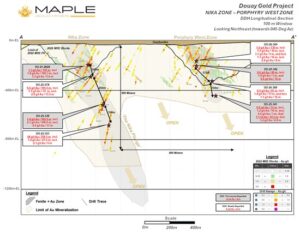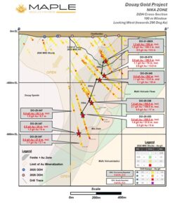 Maple Gold Mines Ltd. (TSX-V: MGM) (OTCQX: MGMLF) (FSE: M3G0) today announced assay results from 14 drill holes completed during its ongoing, fully-funded 30,000-metre winter drill campaign at its 100%-owned Douay Gold Project and Joutel Gold Project located along the Casa Beradi-Douay Gold Trend in Québec, Canada. Results include 12 drill holes from the Nika Zone and two (2) drill holes from the Porphyry West Zone, targeting higher-grade southeast-plunging shoots to confirm continuity and extend mineralization at depth following encouraging results from the 2025 winter program.