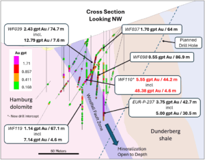 Over the past six months, drilling at the northern end of the Windfall deposit has been returning good gold grades over long widths, with today’s result from drill hole WF110 intersecting 5.55 gpt gold over 44.2 meters, including 48.38 gpt gold over 4.6 meters of oxide mineralization. This result followed up on other recently released holes along the same section that also intersected oxide mineralization, such as 2.43 gpt gold over 74.7 meters (drill hole WF039), 1.70 gpt gold over 64.0 meters (drill hole WF037) and 1.14 gpt gold over 67.1 meters (drill hole WF119). A deeper historical hole, located approximately 40 meters below these results, returned 3.75 gpt gold over 42.7 meters (drill hole EUR-P-237), indicating that the higher-grade mineralization remains open to expansion at depth (Fig. 2). Drilling is planned to target this deeper area in March. The Company believes there is good potential to continue expanding the mineralization with additional investment.