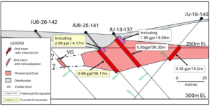 • Early drilling at the “826 Zone” expands the gold system, extending known mineralization by up to 80 metres (see Figures 1 and 2 and tabulated in Tables 1 and 2). Drill hole JU826-141intersected near-surface gold mineralization within 20 metres of surface, returning 2.09 g/t Au over 4.17 m, within a broader mineralized interval of 0.70 g/t Au over 28.17 m (19.83 m to 48.00 m).