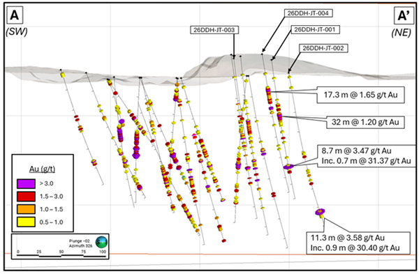 Table 1. Consolidated results from holes 26DDH-JT-001 through 26DDH-JT-004. Reporting limits are a minimum of 3 m > 0.5 g/t Au or 2 m > 1 g/t Au. All results over 0.5 g/t Au can be found on Miata’s website through this link.