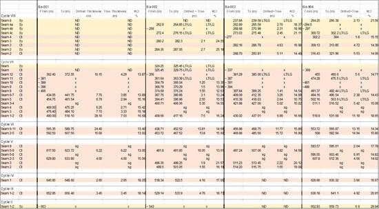ND no data, as the cycle has not been preserved in this drill hole (BA-001 Cycle VIII) or has not been drilled Cycle II to Cycle IV in Ba-003