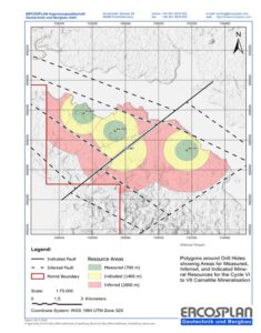Cycles VI and VII in BA-001 display anomalous thickness which may be a local feature related to proximity to a NE-SW trending fault and localized folding. ERCOSPLAN has interpreted the substantial thicknesses of Cycles VI and VII to be local features and in order to be conservative in the resource estimate, have calculated True Thicknesses for all the seams in these two cycles through structural analysis and comparisons to adjacent, unaffected drillhole stratigraphy. Minor uncertainty remains regarding the exact position of this fault and consequently a 200 m wide barrier with no Mineral Resources is defined along the interpreted fault. Uncertainty around additional faults interpreted from the seismic sections are accommodated by a non-resource zone 100m wide associated with each potential fault.