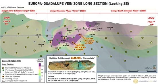 Europa drilling in 2025 has extended know mineralization at Europa, most notably down-dip in holes AL25-135 and AL25-137 (Table 1 and Figure 3). Holes AL25-131, AL25-134, and AL25-139 filled in gaps between known vein intersections. Assays are pending for several more holes at Europa and drilling continues to step out along strike and down dip. Significant mineralization was intersected in Hole AL25-135 which returned 5.85 m of 476 g/t AgEq including 0.70 m of 2,601 g/t AgEq (2,180 g/t Ag); and hole AL25-139 returned 2.40 m of 499 g/t AgEq including 0.50 m of 1,366 g/t AgEq (851 g/t Ag).