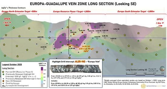 “Drilling continues to demonstrate the continuity of high-grade silver mineralization down dip and along strike,” stated Darrell Rader, President and CEO of Minaurum Gold. “At the Europa stacked vein system, hole AL25-142 vein intersected three intervals of significant mineralization, yielding targets for further drilling and resource development.”