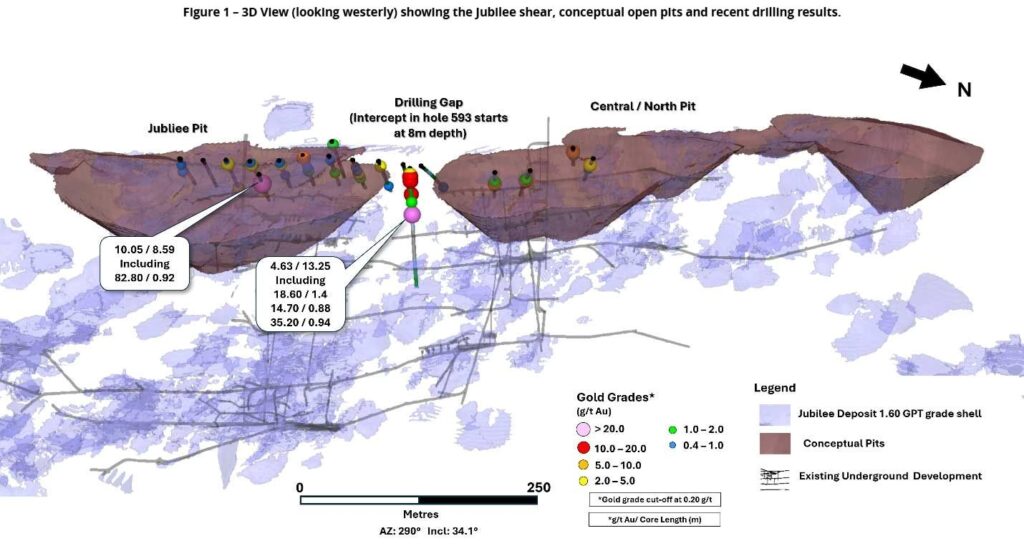 The new results demonstrate that gold mineralization in the Jubilee Shear extends to surface in the crown pillars of the historical mines and that significant zones of mineralization remain to be discovered in areas that were sparsely or untested in historical drilling programs. With additional infill drilling, the new zone of gold mineralization intersected in SD-25-593 has the potential to expand the mineral resource with open pit potential in the Jubilee Shear. The intersection in SD-25-616 could also increase the high-grade mineral inventory available in the areas with open pit potential.