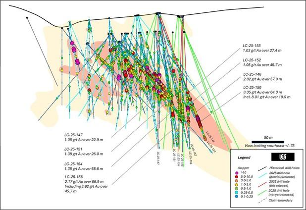 The 2025 drill program at Lapon Canyon is focused on resource definition where drill holes were both infill and offset along strike and dip of the Hotspot Zone and on exploration of the new upper drill road extension, located approximately 125 metres northeast of the Hotspot Zone. Drilling at Hotspot has significantly extended gold mineralization to the south and the east.