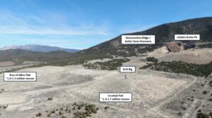 Figure 3 – Picture of sonic drill rig drilling the historic Crushed leach pad with labels for the previously mined Golden Butte pit, Resurrection Ridge target area, and the historic Run-of-Mine leach pad.