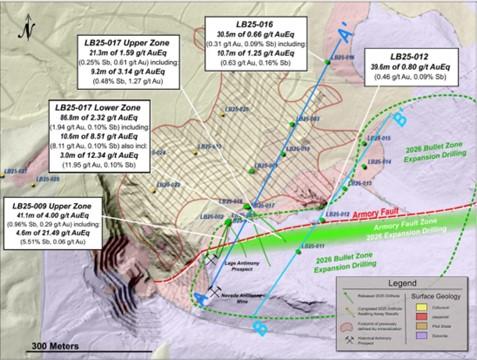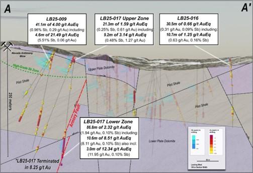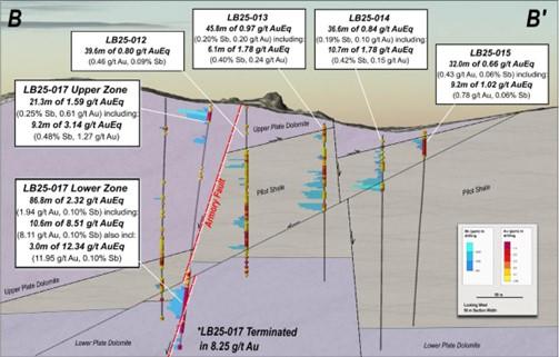 • LB25-017 Lower Zone (step-out, new “Armory Fault” discovery): 12.34 g/t AuEq* over 3.0 meters (11.95 g/t Au and 0.10% Sb) within 8.51 g/t AuEq* over 10.6 meters (8.11 g/t Au and 0.10% Sb), within 2.32 g/t AuEq* over 86.8 meters (1.94 g/t Au and 0.10% Sb); due to drilling conditions, the hole terminated in 8.25 g/t oxide Au, with the highest interval up to 12.80 g/t oxide Au