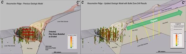 Figure 4 – Comparison of historical geological model (left) and new NevGold geological model (right) outlining the thesis that the older dolomite unit was thrust over the prospective Pilot Shale unit. The preserved Pilot Shale unit extends more than 1 kilometer east of prior drilling at Resurrection Ridge.