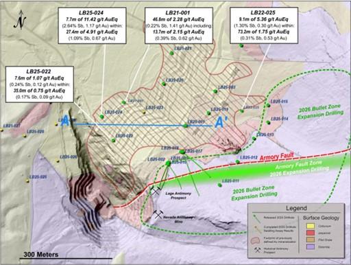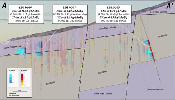 • LB25-022 (MRE upgrade, gap in antimony data): 1.07 g/t AuEq* over 7.6 meters (0.24% Sb and 0.12 g/t Au), within 0.75 g/t AuEq* over 35.0 meters (0.17% Sb and 0.09 g/t Au)