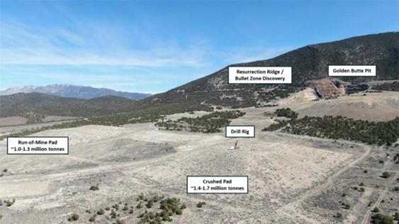 Figure 3 – Picture of sonic drill rig drilling the historical Crushed leach pad with labels for the previously mined Golden Butte pit, Resurrection Ridge target area, and the historical Run-of-Mine leach pad.